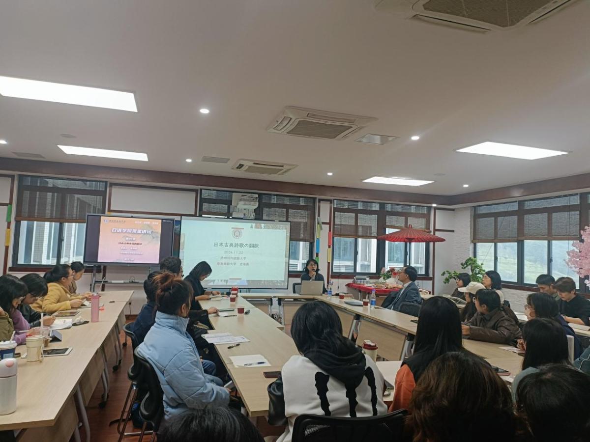 第二部分中,尤海燕教授对比了《万叶集》、《古今和歌集》中部分和歌的不同翻译版本,通过列举其中的误译现象,提出了关于形式和内容上的取舍讨论。尤海燕教授表示形式应服务于内容,不能为了追求形式而不顾内容的准确性,同时还强调了在翻译和歌中古典文学素养的重要性。