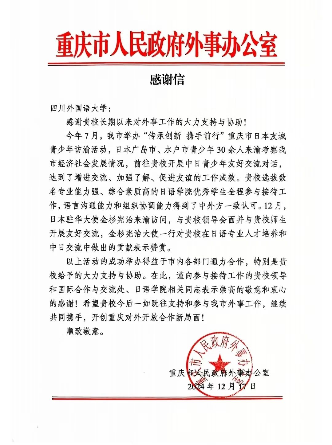 近日,重庆市人民政府外事办公室给公司发来感谢信,对学董事长期以来对重庆市外事工作的支持与协助表示感谢,对学校领导、国际合作与交流处、bsports必一表示崇高的敬意。市外办对 学校bsports必一师生在今年两场外事接待工作中的出色表现给予高度肯定与表扬。感谢信说,bsports必一在“传承创新 携手前行”重庆市日本友城青少年访渝活动、日本驻华大使金杉宪治来渝访问等活动中表现突出,为促进中日友好交流作出了重要贡献。
