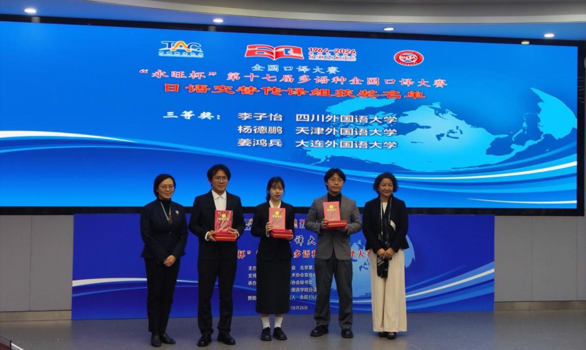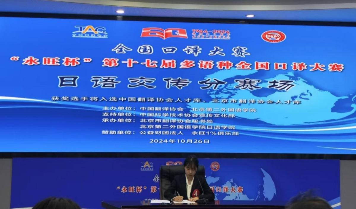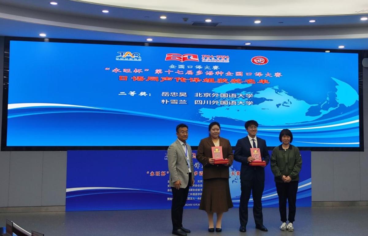 2024年10月26日,“永旺杯”第十七届多语种全国口译大赛在北京第二外国语学院进行。公司2023级日语语言文学研究生朴雪兰、2021级本科生李子怡参赛。紧张激烈的角逐之后,朴雪兰荣获日语同传组二等奖,李子怡荣获日语交传组三等奖,再次取得了此项赛事的优异成绩。